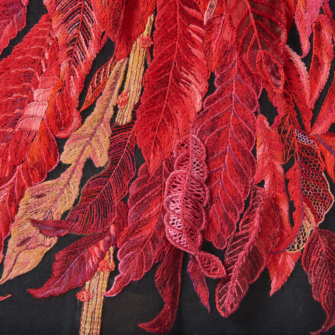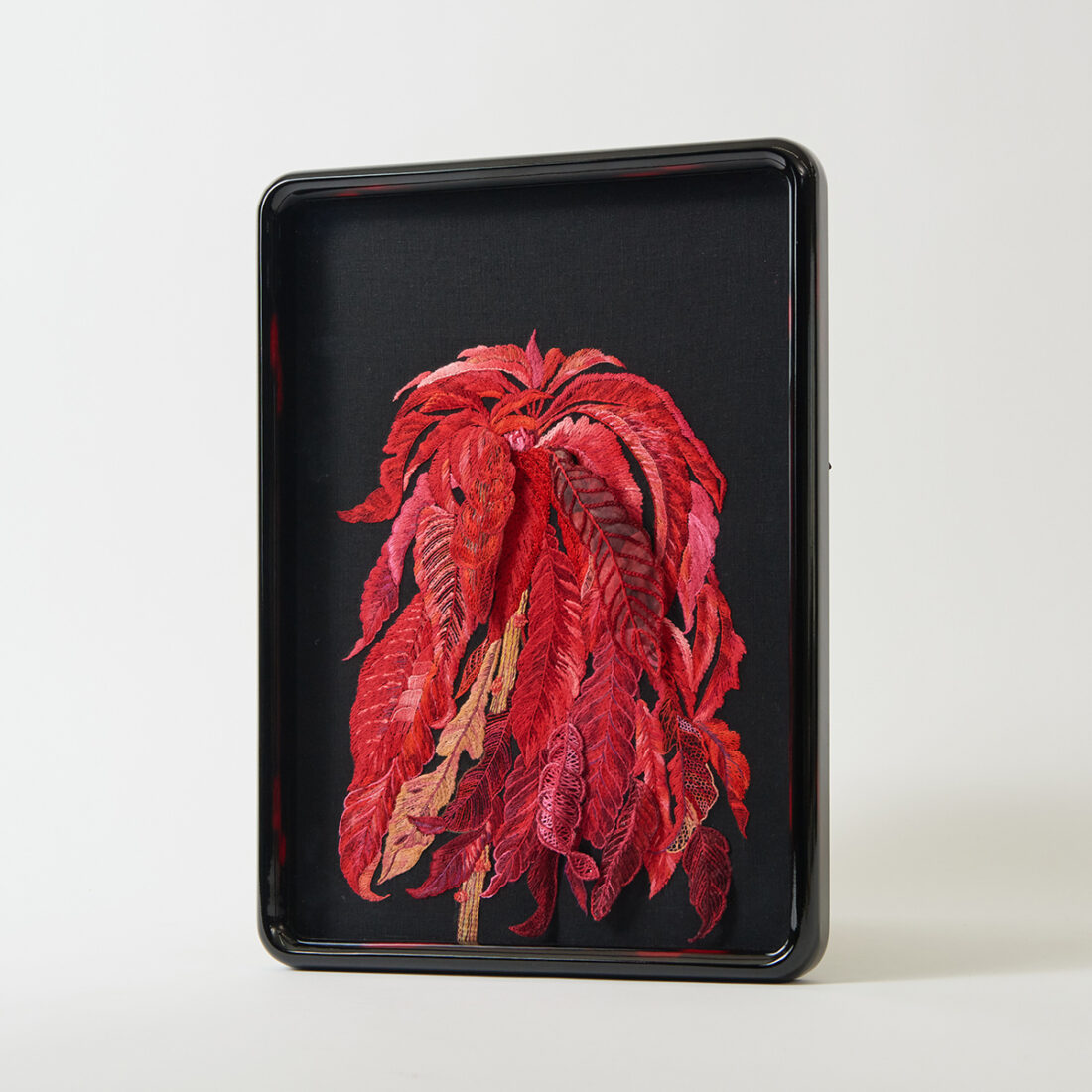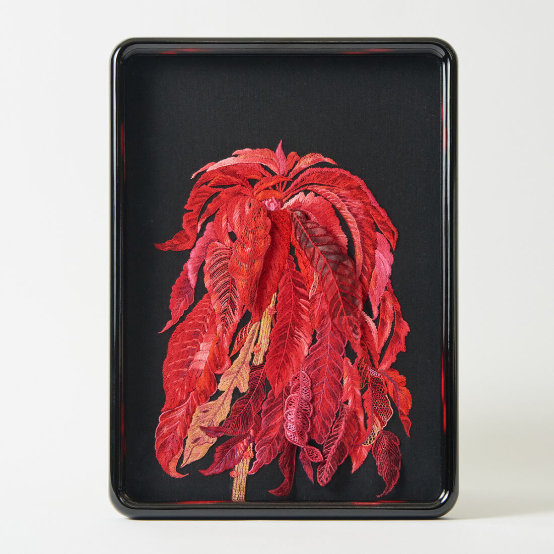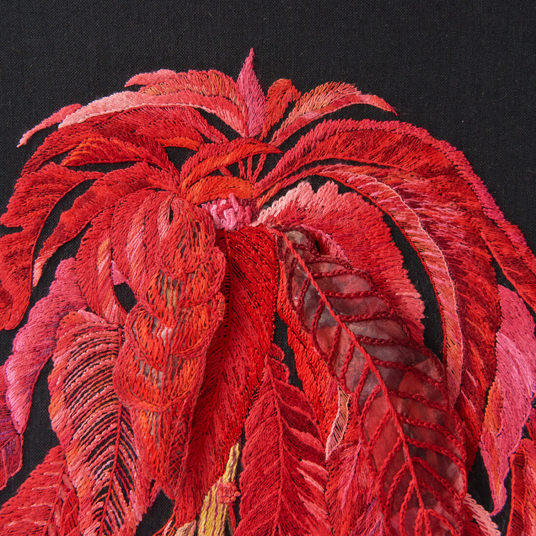 会員より寄贈を受けた作品です。現在、参考作品として協会所蔵作品として記念会館に展示中です。動きが止まることのない鶏の鶏冠と羽をイメージし、赤色の濃淡で立体感を出し、活発に動く鶏を表現。細やかな糸使いをご覧いただくことができます。
